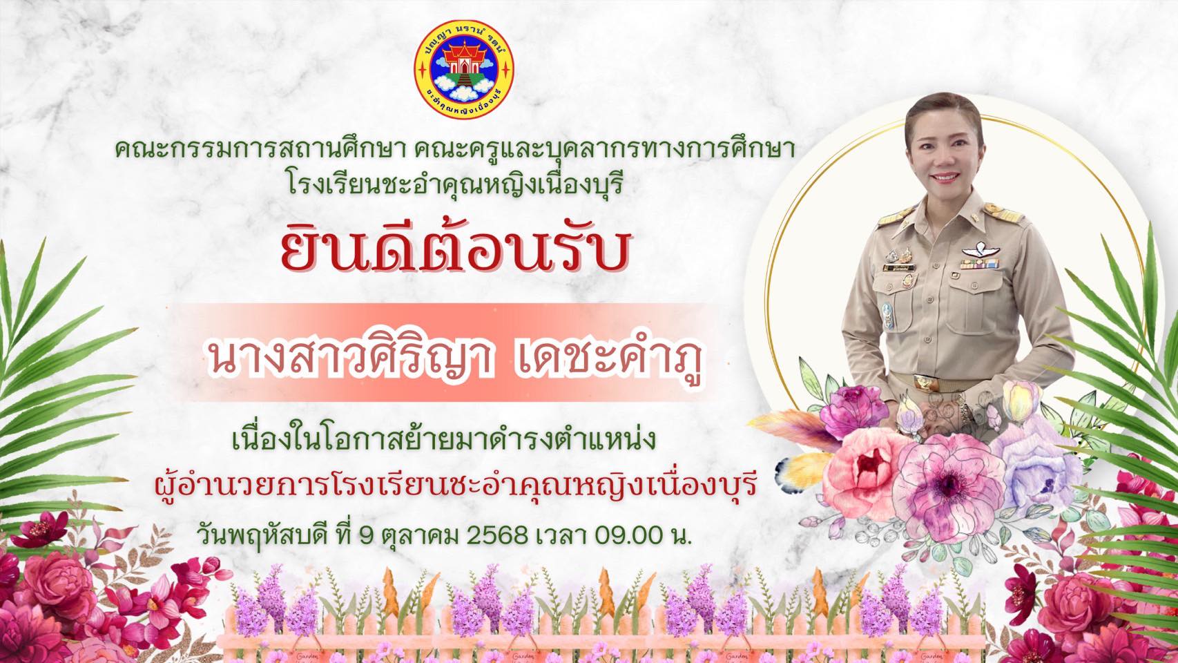 ยินดีต้อนรับ นางสาวศิริญา เดชะคำภู เนื่องในโอกาสย้ายมาดำรงตำแหน่งผู้อำนวยการโรงเรียนชะอำคุณหญิงเนื่องบุรี