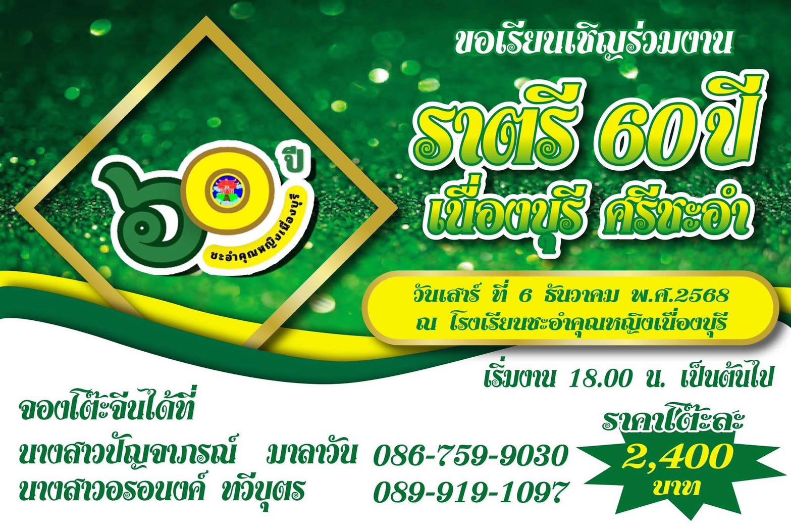 ประชาสัมพันธ์การจำหน่ายบัตรโต๊ะจีน งาน”ราตรี 60 ปี เนื่องบุรี ศรีชะอำ” ศิษย์เก่า ผู้ปกครอง นักเรียนโรงเรียนชะอำคุณหญิงเนื่องบุรี โดยสามารถจองบัตรได้ตั้งแต่วันนี้เป็นต้นไป เลือกและสำรองโต๊ะจีนโดยดูจากลิงค์ด้านล่าง