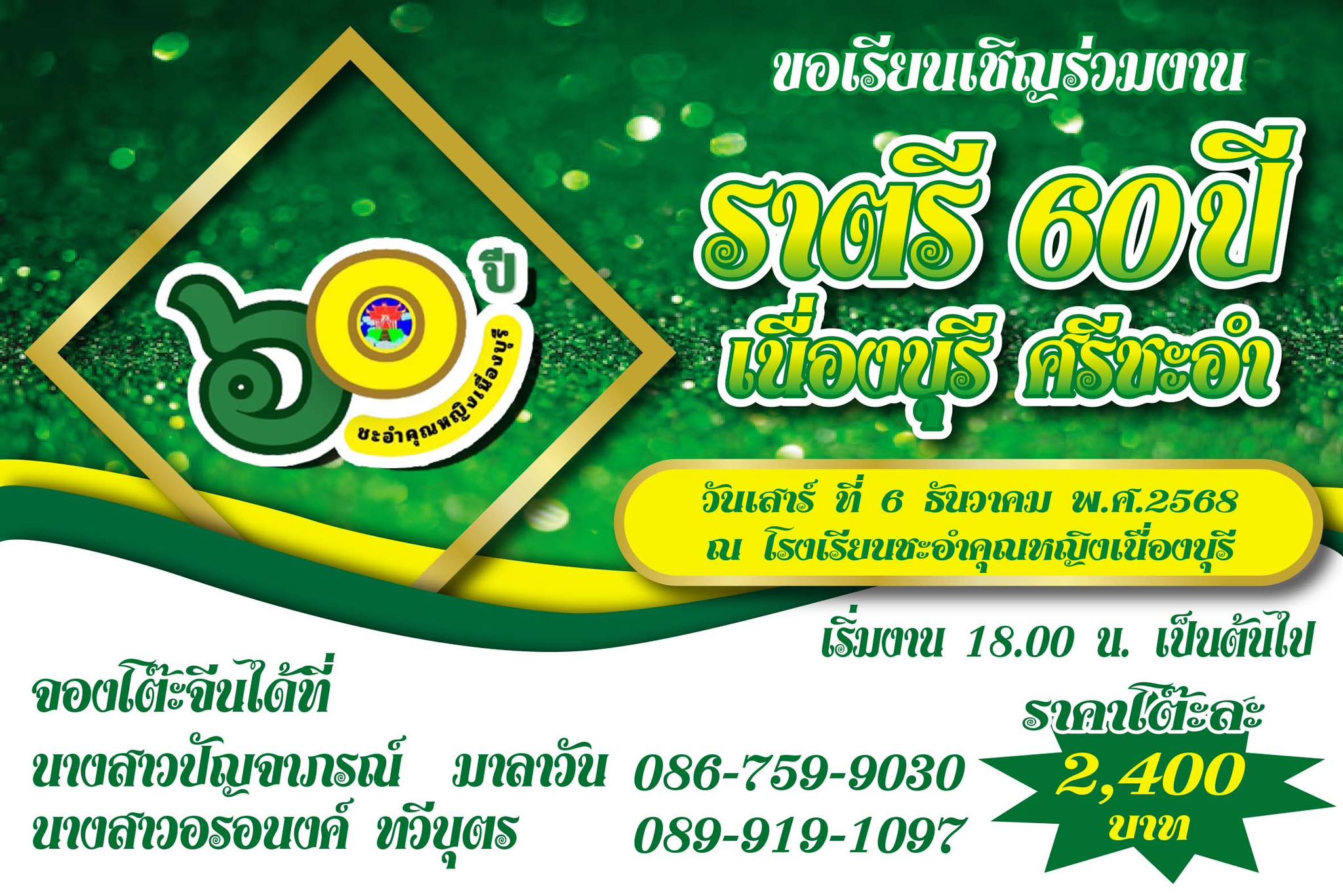 ขอเรียนเชิญร่วมงาน “ราตรี 60 ปี เนื่องบุรี ศรีชะอำ” ครบรอบ 60 ปีชะอำคุณหญิงเนื่องบุรี วันเสาร์ ที่ 6 ธันวาคม พ.ศ. 2568 ณ โรงเรียนชะอำคุณหญิงเนื่องบุรี เริ่มงาน 18.00 น. เป็นต้นไป ราคาโต๊ะละ 2,400 บาท (8 ท่าน) จองโต๊ะจีนได้ที่ นางสาวปัญจาภรณ์ มาลาวัน 086-7599030 และ นางสาวอรอนงค์ ทวีบุตร 089-9191097