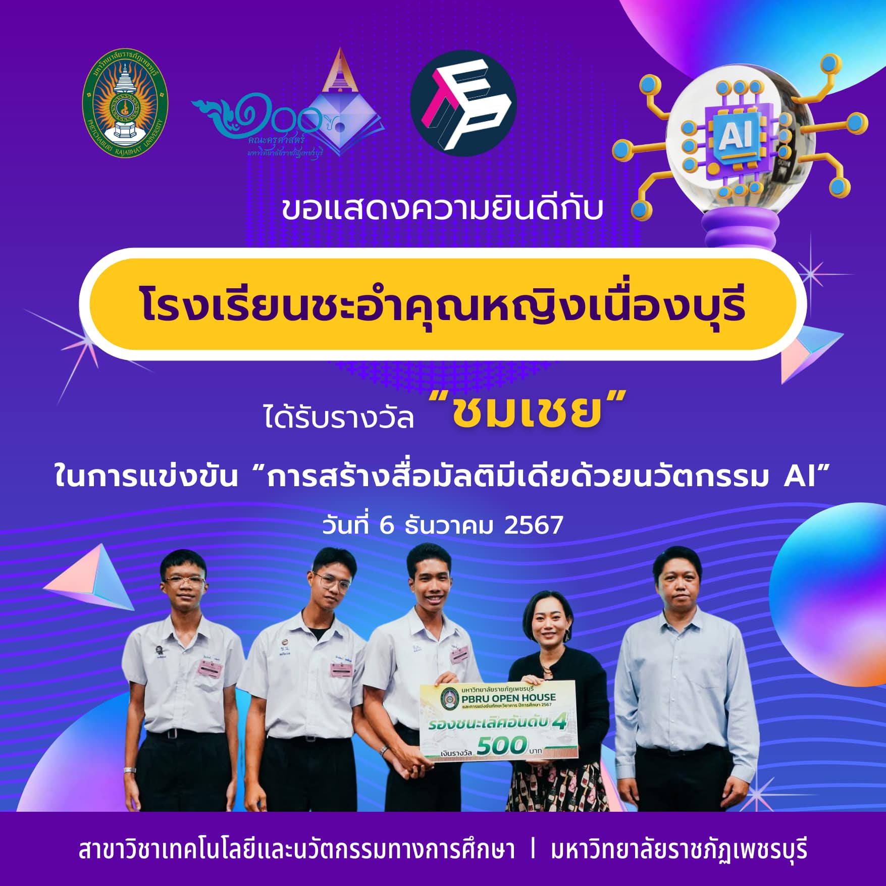 “การแข่งขันสร้างสื่อมัลติมีเดียด้วยนวัตกรรม Al“ จัดโดยสาขาวิชาเทคโนโลยีและนวัตกรรมทางการศึกษา คณะครุศาสตร์ มหาวิทยาลัยราชภัฏเพชรบุรี