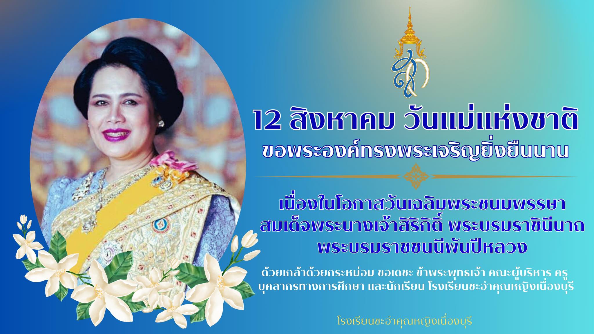 12 สิงหาคม 2568 วันแม่แห่งชาติ ขอพระองค์ทรงพระเจริญยิ่งยืนนาน เนื่องในโอกาสวันเฉลิมพระชนมพรรษา สมเด็จพระนางเจ้าสิริกิติ์ พระบรมราชินีนาถ พระบรมราชชนนีพันปีหลวง ด้วยเกล้าด้วยกระหม่อม ขอเดชะ ข้าพระพุทธเจ้าคณะผู้บริหาร ครู บุคลากรทางการศึกษาและนักเรียนโรงเรียนชะอำคุณหญิงเนื่องบุรี