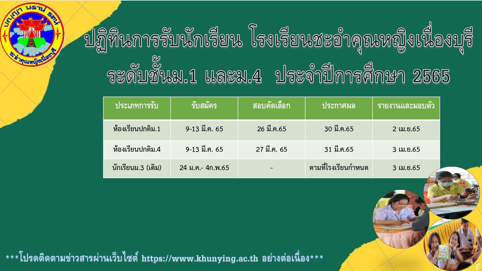 ปฏิทินการรับสมัครนักเรียนระดับชั้นมัธยมศึกษาปีที่ 1 และมัธยมศึกษาปีที่ 4 ปีการศึกษา 2565 โรงเรียนชะอำคุณหญิงเนื่องบุรี