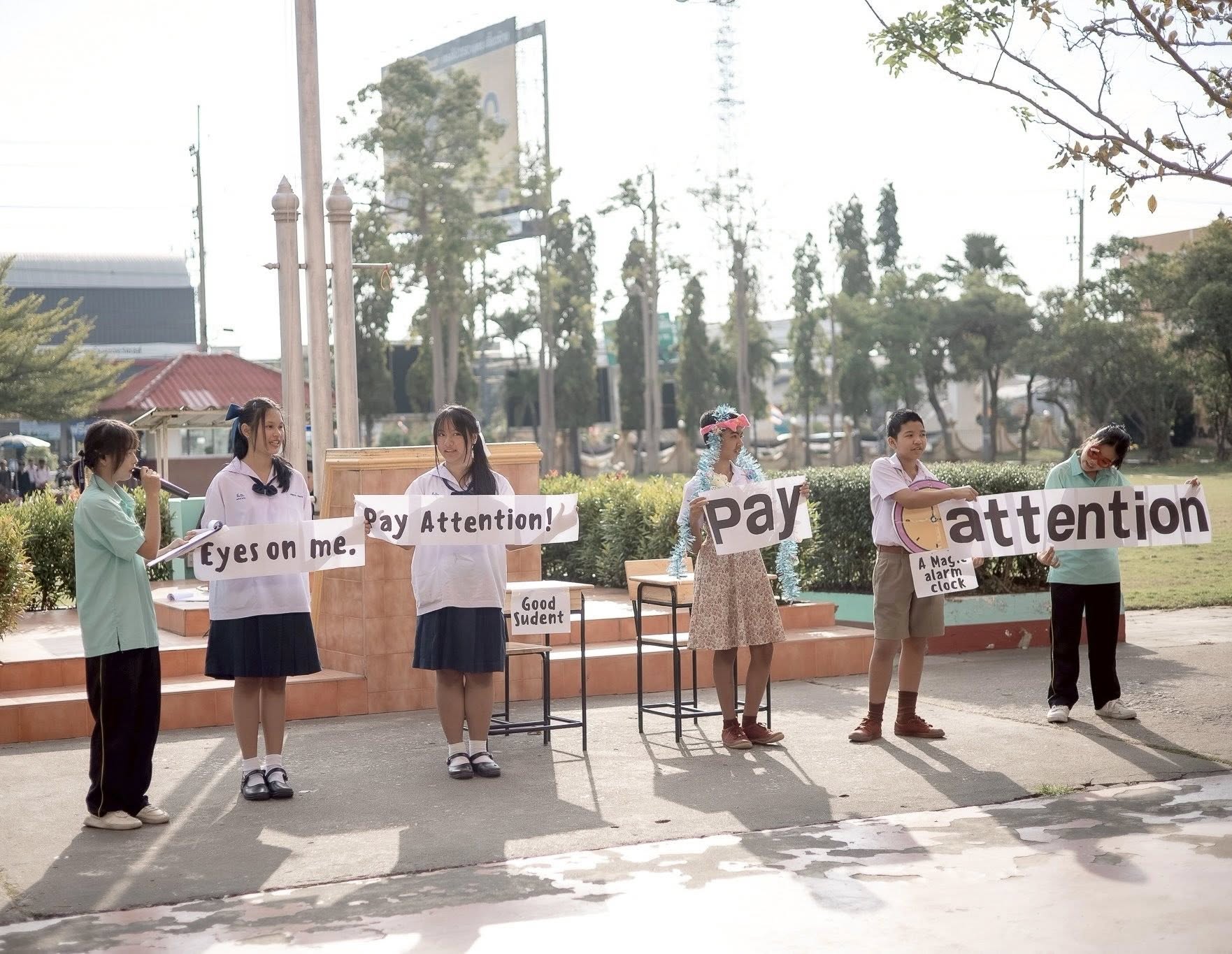 กลุ่มสาระการเรียนรู้ภาษาต่างประเทศโรงเรียนชะอำคุณหญิงเนื่องบุรี ได้จัดกิจกรรม English Daily Language วันนี้นำเสนอคำศัพท์และสำนวนภาษาอังกฤษ ได้แก่ “Pay Attention” แปลว่า ตั้งใจเรียน และสำนวน “Eyes on me. Pay attention!” แปลว่า ตั้งใจฟังคุณครู กิจกรรมในวันนี้นำเสนอในรูปแบบ Short Play เรื่อง “A Magic Alarm Clock in the Classroom”