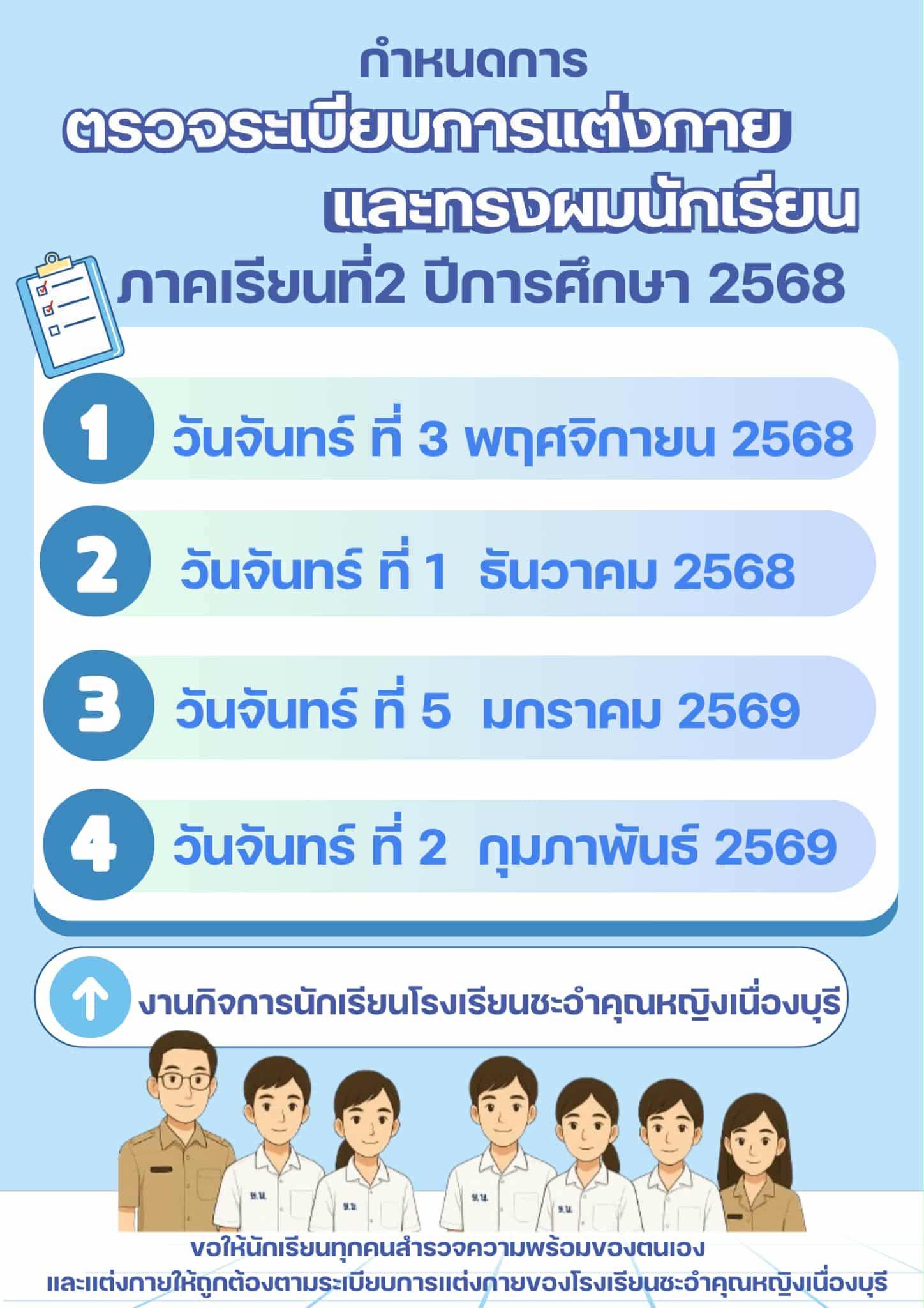 กำหนดการตรวจระเบียบการแต่งกายและทรงผมนักเรียน ภาคเรียนที่ 2 ปีการศึกษา 2568